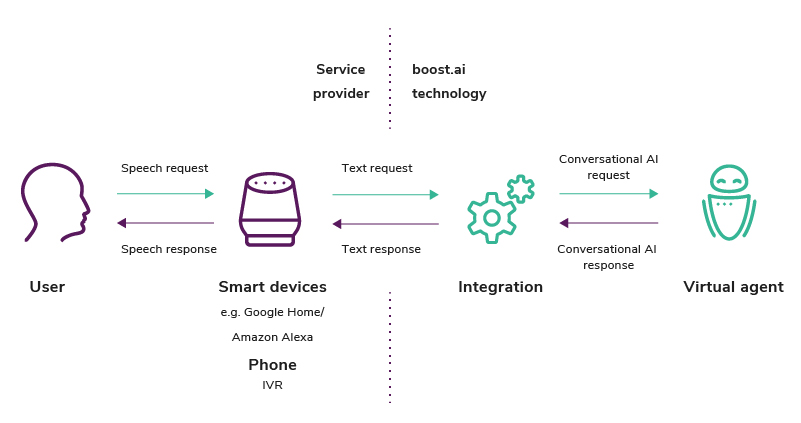 Boost.ai currently integrates with Google Home and Amazon Alexa. We also support IVR using Twilio.