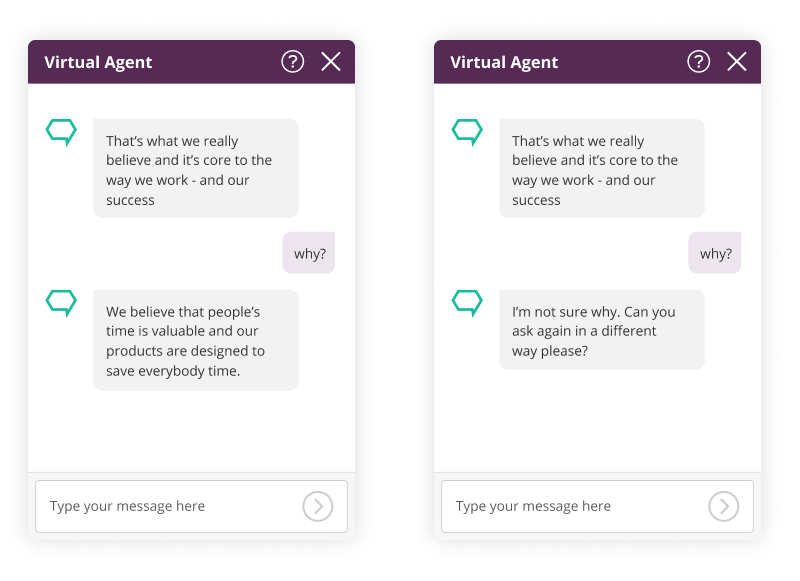For example, a user may ask a question about boost.ai’s company values. They may then want to follow up for more information and ask ‘why’?: