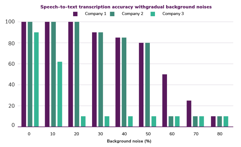 Note: Decibel values for background testing have not been noted. This article is designed purely to highlight the importance of carrying out effective benchmarking, not to suggest a maximum background noise level that stops speech-to-text from functioning.