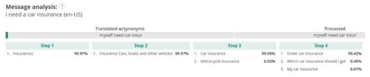 We can see from the backend how the virtual agent interprets the query and has no trouble identifying the correct intent - in this case, ‘Order car insurance’ - with a probability score of 99.42%.