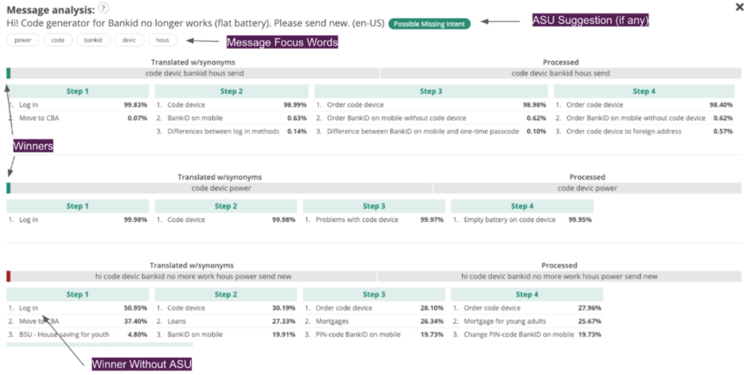 Both the ASU neural network (let’s call it ASUNet) and our reduction algorithm are trained on customer data, just like all other neural networks in boost.ai’s solution. This means they are also able to parse synonyms, acronyms and important words with relative ease.