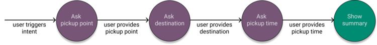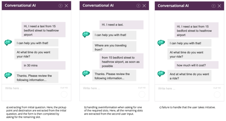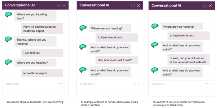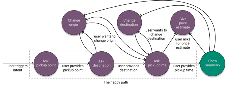 A big issue with the FSM approach is that every state and transition needs to be explicitly defined. It's possible to fix some of the issues listed above by adding new states and transitions. For example, we might create a transition from the state “Ask pickup time” to “Give price estimate” in order to solve example b) in Figure 3. However, since every transition needs to be mapped explicitly, the complexity of the system quickly becomes unmanageable for real projects.