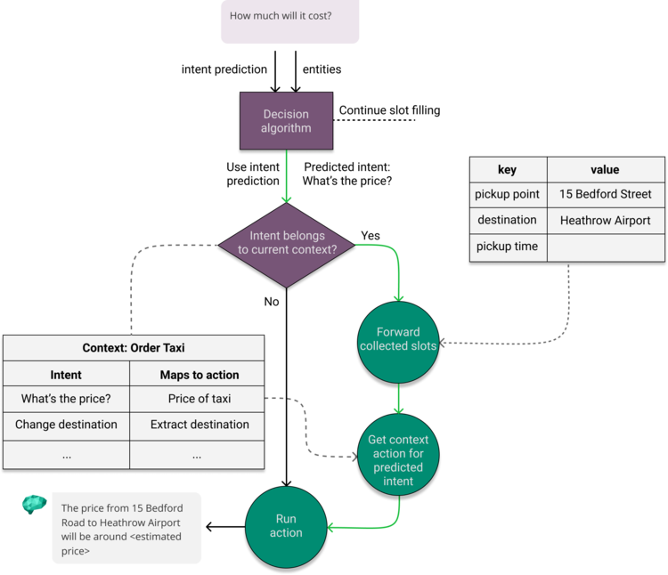 In addition, context actions let us temporarily map intents to different actions than they would typically map to by default. This makes it possible for a single intent to point to different actions in different contexts. For example, the question ‘How much will it cost?‘ should give a different reply when the user is ordering a taxi than if he or she is applying for a monthly taxi membership.