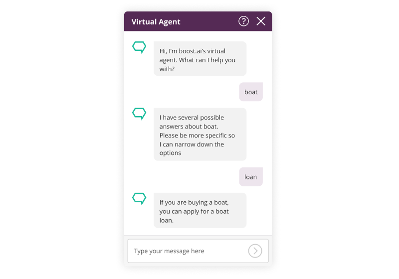 First, it understands that “boat” is something the customer wants to know more about, but it’s too vague. It asks for more details so it can narrow it down. Even though the second response is very limited, it’s still able to remember the previous input and understands that the customer is probably interested in purchasing a boat and provides relevant information on boat loans.