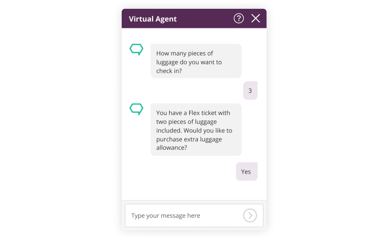 Here, the virtual travel agent is able to offer the customer the option to purchase additional baggage allowance by matching their input against information it holds about their ticket. Add-on sales and a feeling of proactive service for the customer provided in one swoop.